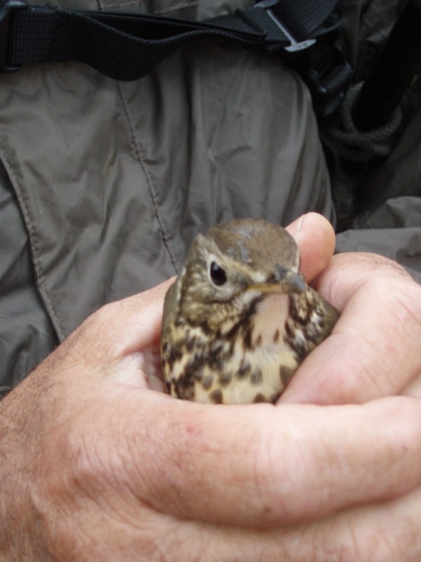 Nous revenons par le circuit rouge que vous pouvez voir sur la carte. Joël trouve une grive qui volète au sol, sûrement blessée. Elle finit par lui fausser compagnie et nous nous doutons du sort qui l'attend.