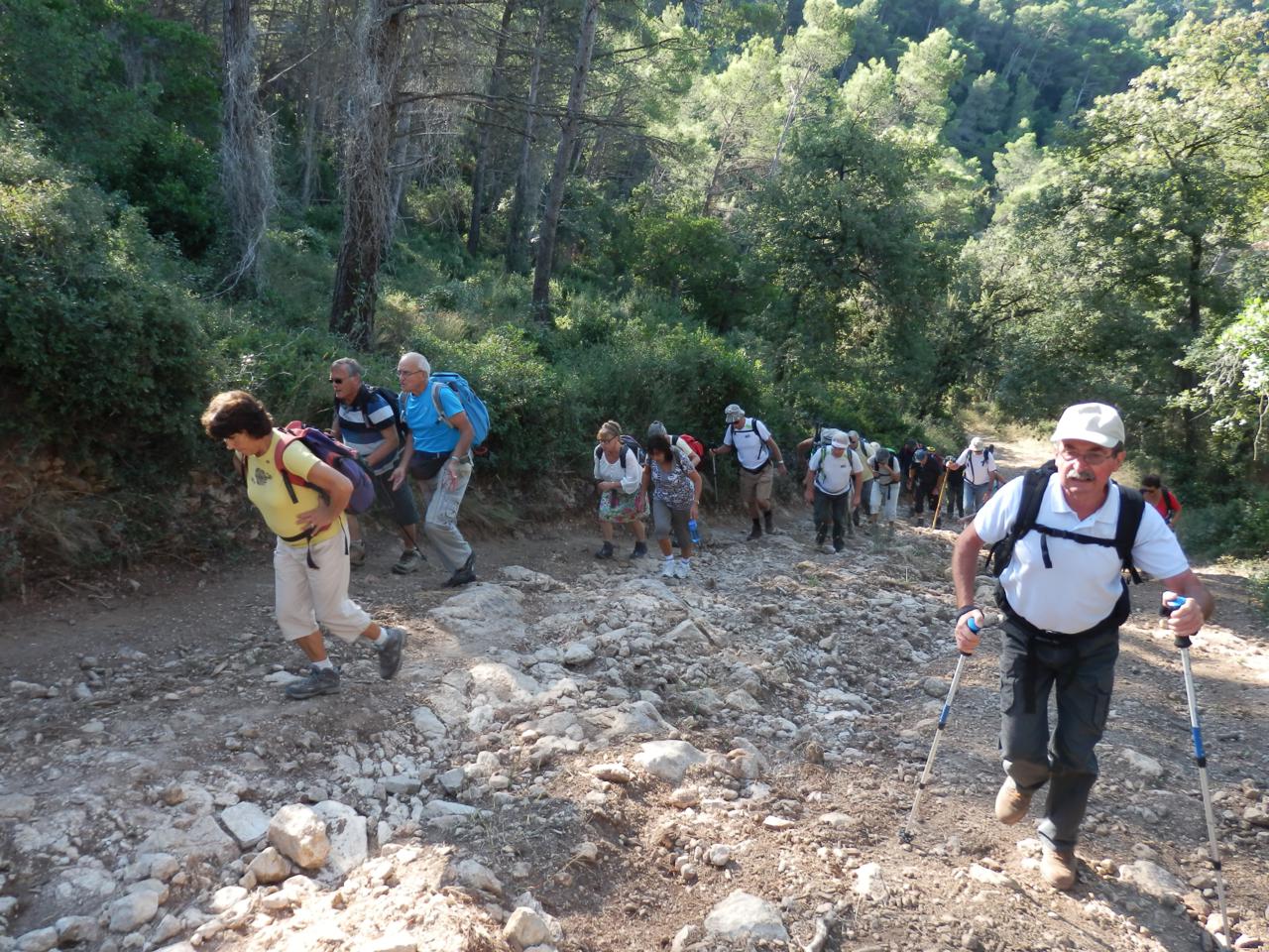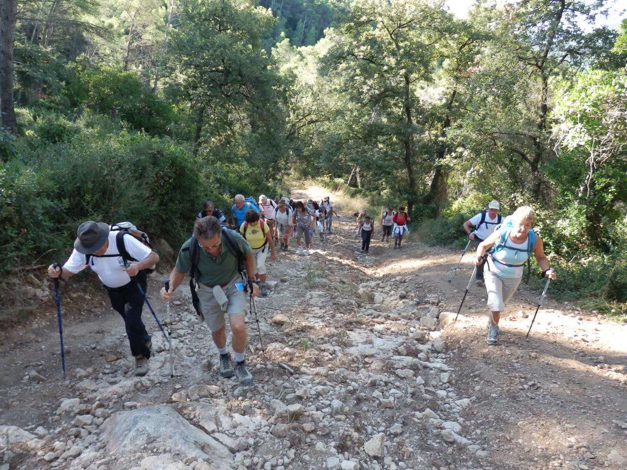 Les "lièvres" nous ont attendus pour l'apéro et pour fêter l'anniversaire de Pierre, Jacqueline nous régale de ses délicieux gâteaux au chocolat. Après les dernières infos données par René, nous repartons par le même sentier, tantôt à l'ombre au milieu des lauriétins, tantôt dans des pentes arides.