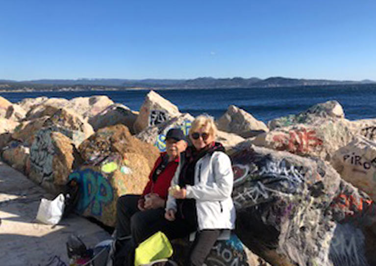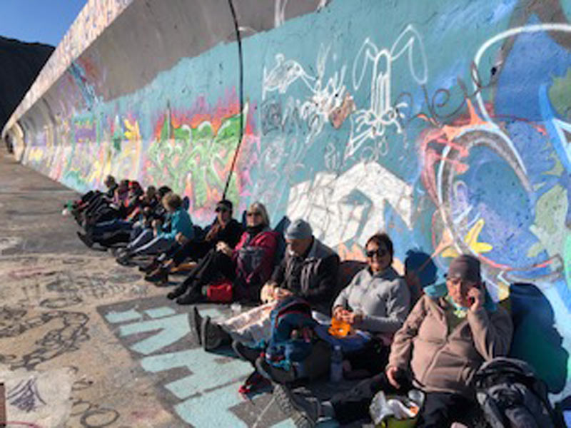 Nous nous installons à l’abri du vent et en plein soleil pour le pique-nique. Le mur est rempli de graff, certains assez jolis.