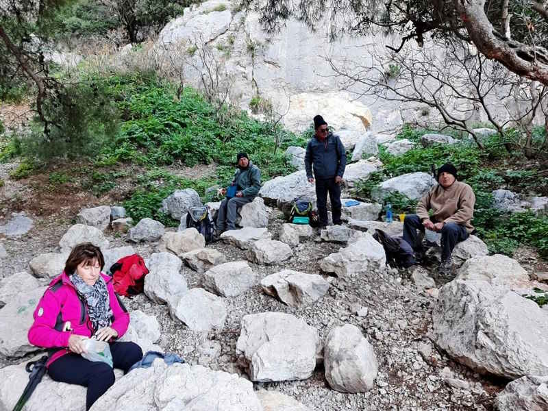 A l'heure du pique nique, nos amis conduits par Gérard font une pause rapide, vue la température refroidie par le vent. Le retour emprunte le même chemin qu'à l'aller, le GR étant en travaux. Le rythme a donc été adapté aux efforts nécessités par le dénivelé plus important que prévu. Les grimpeurs emmenés par Tony, s'installent quant à eux en haut d'une falaise. Jean Paul traduit sur sa toile ce moment de repos avant la poursuite des "festivités" physiques, dans les roches calcaires, qui s'achèvent le long d'une piste puis encore une dernière grimpette pour atteindre notre parking.