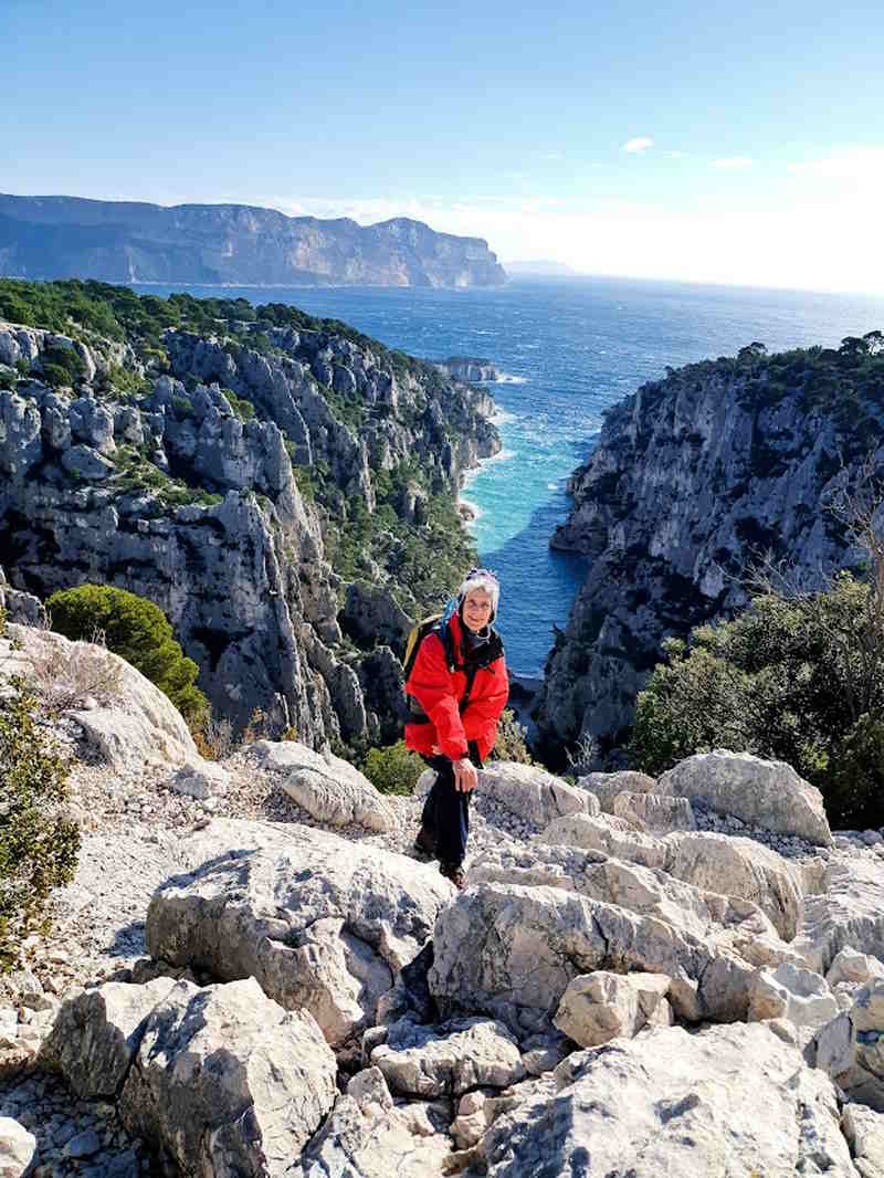 Nous nous séparons au niveau d'un belvédère : Gérard part vers l'est avec son groupe, pour effectuer la descente vers la calanque d'En Vau. L'équipée "Tony-que" démarre les grimpées dans les roches, en agrippant avec les mains aux aspérités des pierres, pieds calés dans des interstices. Nous nous entraidons et notre serre-file Yves est sollicité pour guider les positions adaptées à cette escalade.