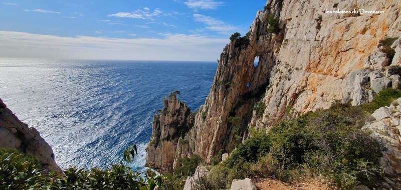 Dans une symphonie de couleurs avivées par le vent, les falaises abruptes plongent dans les eaux d'un bleu profond, bordées d'éclaboussures blanches. Les flots coiffés d'ondulations frissonnantes se drapent de leur écume scintillante au soleil. Dans les criques, l'eau cristalline s'engouffre avec fougue. Magnifique paysage récompense de nos efforts !!!