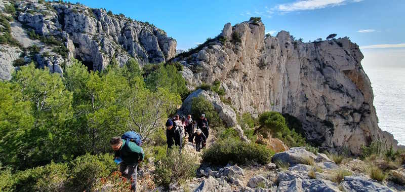 Sous des rafales de vent d'est, nous voilà au départ du parking de la Gineste, face à Carpiagne, emmitouflés pour démarrer notre première grimpée. Deux parcours proposés, l'un très sportif et physique, le second, niveau intermédiaire en terme de difficultés mais tout aussi spectaculaire bien sûr au cœur de cet univers d'une beauté enivrante. C'est le deuxième choix offert à nos membres pour élargir la participation.