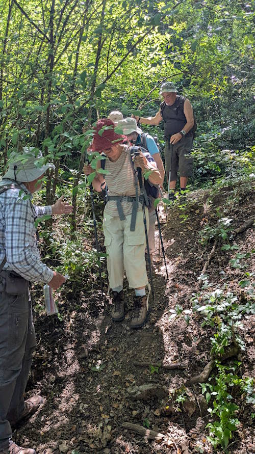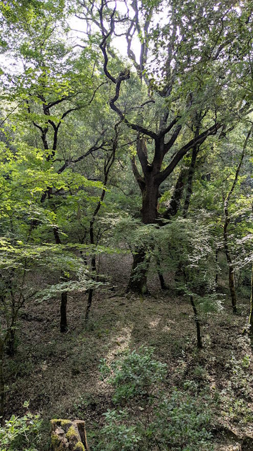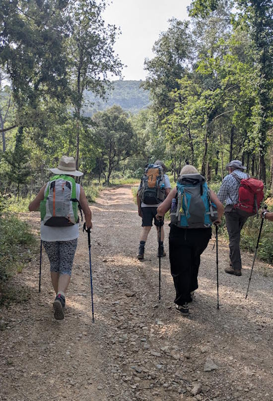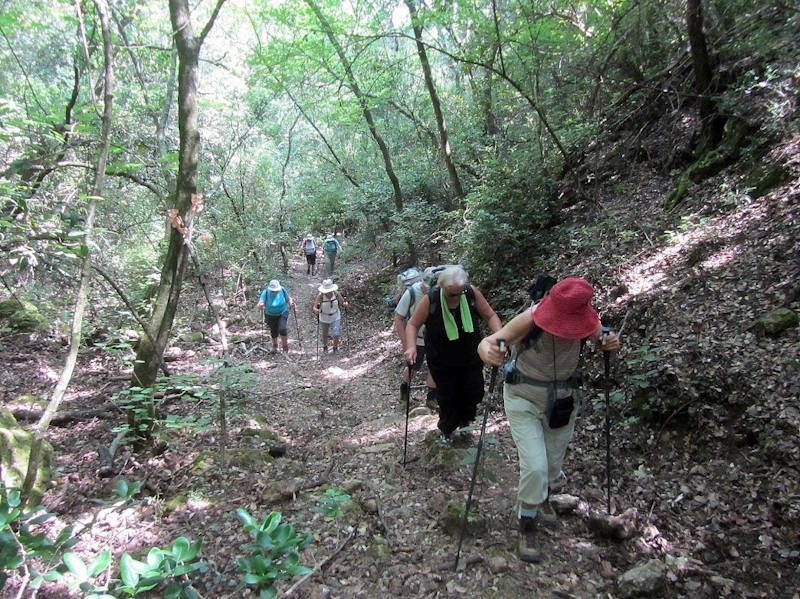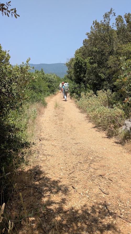C'est un vrai plaisir de marcher dans cette forêt et on en oublie le dénivelé. L'heure du déjeuner arrive et nous nous installons en hauteur où il y a un peu d'air. Nous voyons le village de Signes et ses collines en face dans une brume grise. La fumée des incendies géants du Canada a traversé l'Atlantique, nous en bénéficions, Hélas !