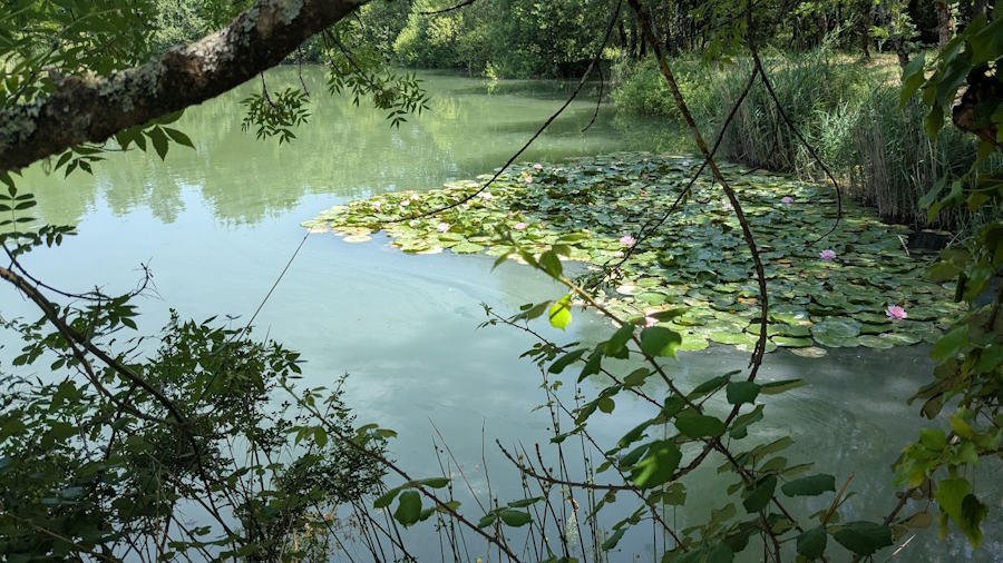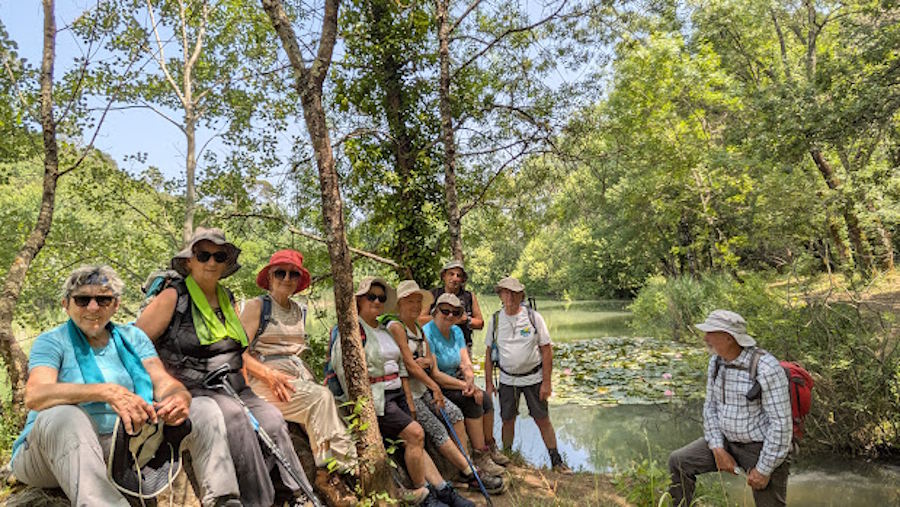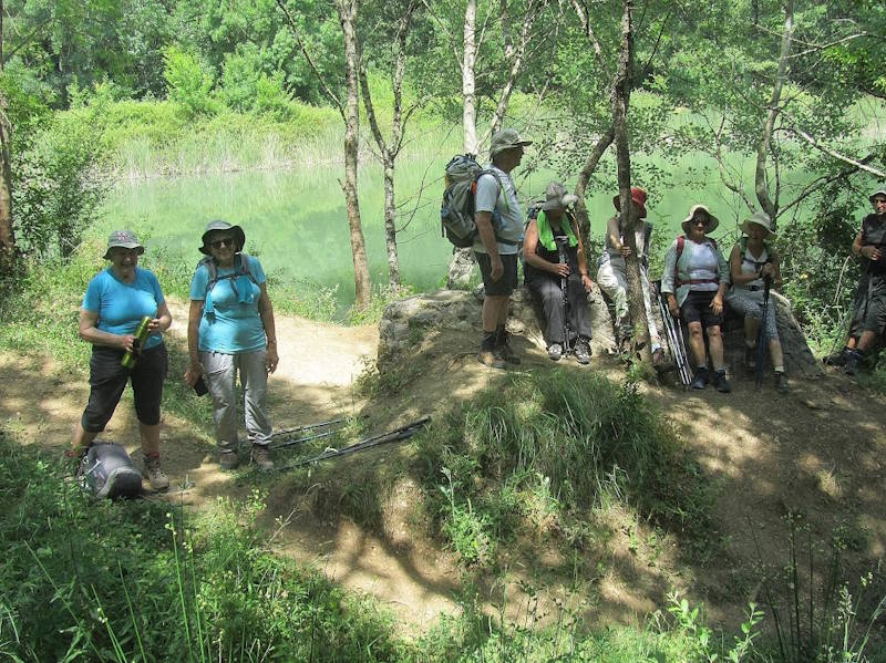Nous repartons en direction de la Font de l'Evoué, petite retenue collinaire d'1/2 hectare avec des gardons et des carpes. Mais pour nous se sont ces lotus en fleurs qui nous régalent. Nous en profitons pour faire la photo de groupe.