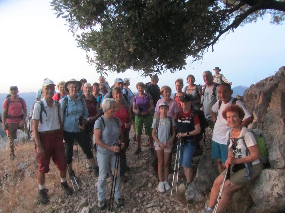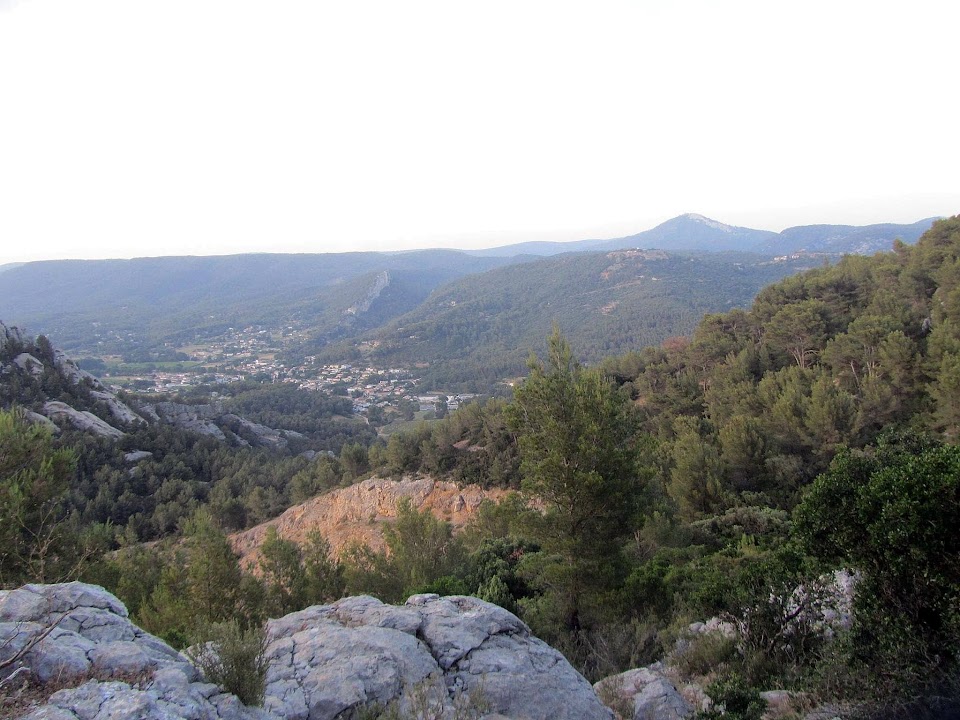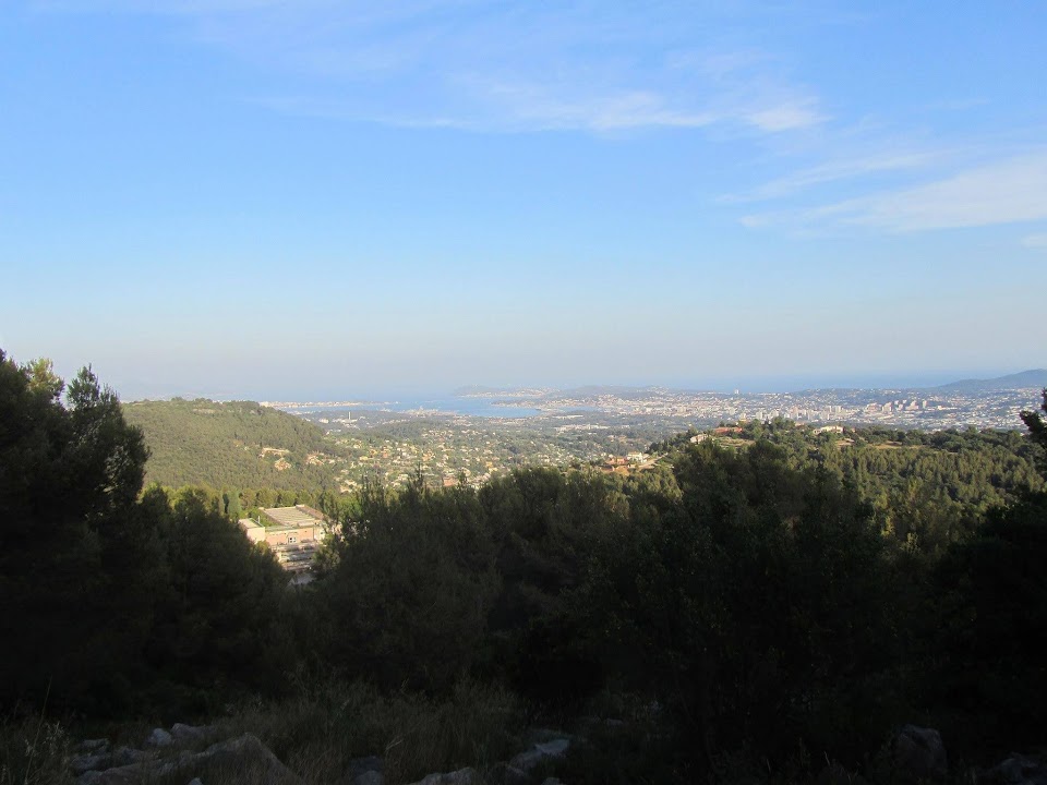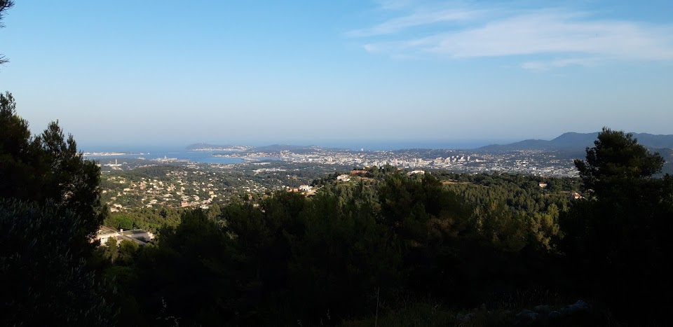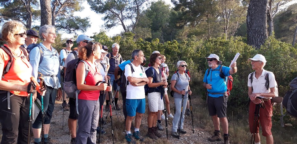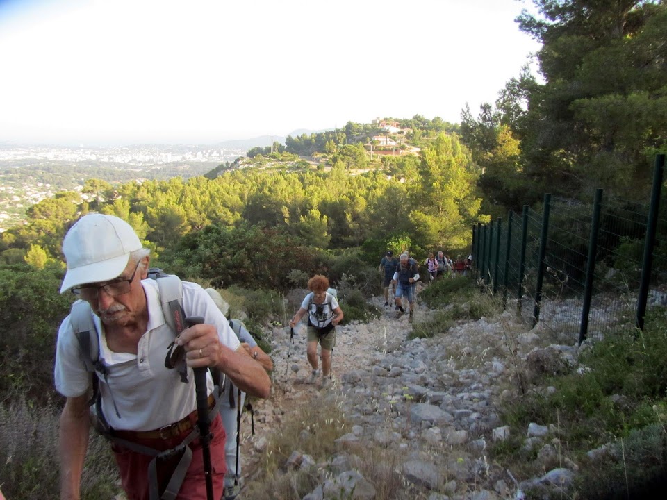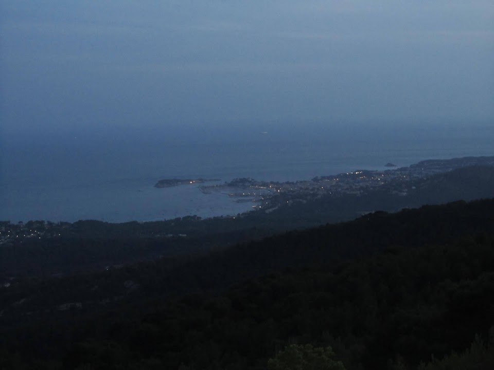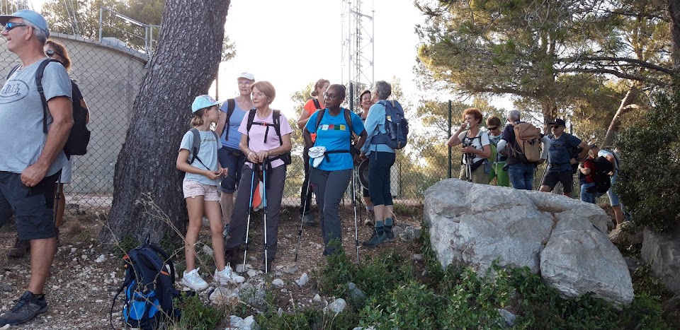 Une randonnée inédite ensoleillée et nocturne pour terminer la saison. Il faisait encore chaud, 32° au départ du parking de l'observatoire, lorsque 26 marcheurs s'en vont allègrement sur un sentier caillouteux qui grimpe sur le fameux "Gros Cerveau", nous offrant une vue panoramique sur la rade de Toulon, Six Fours et la côte ouest puis vers le nord-ouest, les carrières d'Ollioules, les grès de Sainte Anne d'Evenos et à l'horizon dans un voile opaque, le massif de la Sainte Baume.