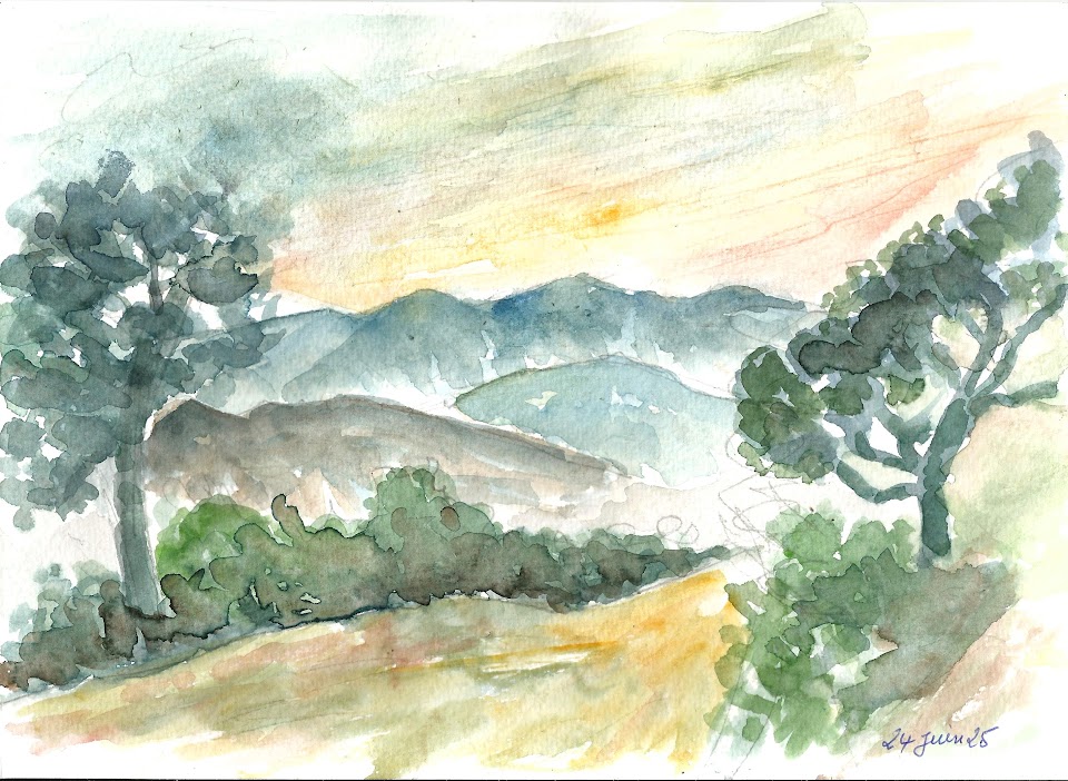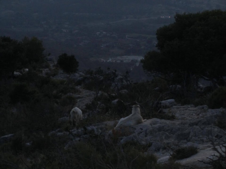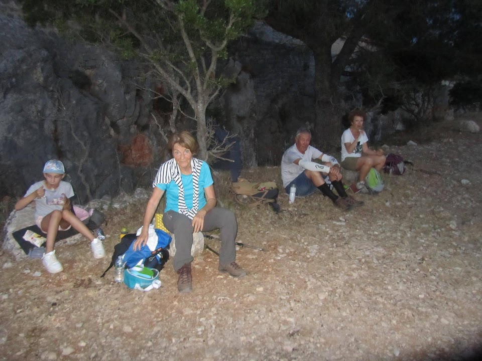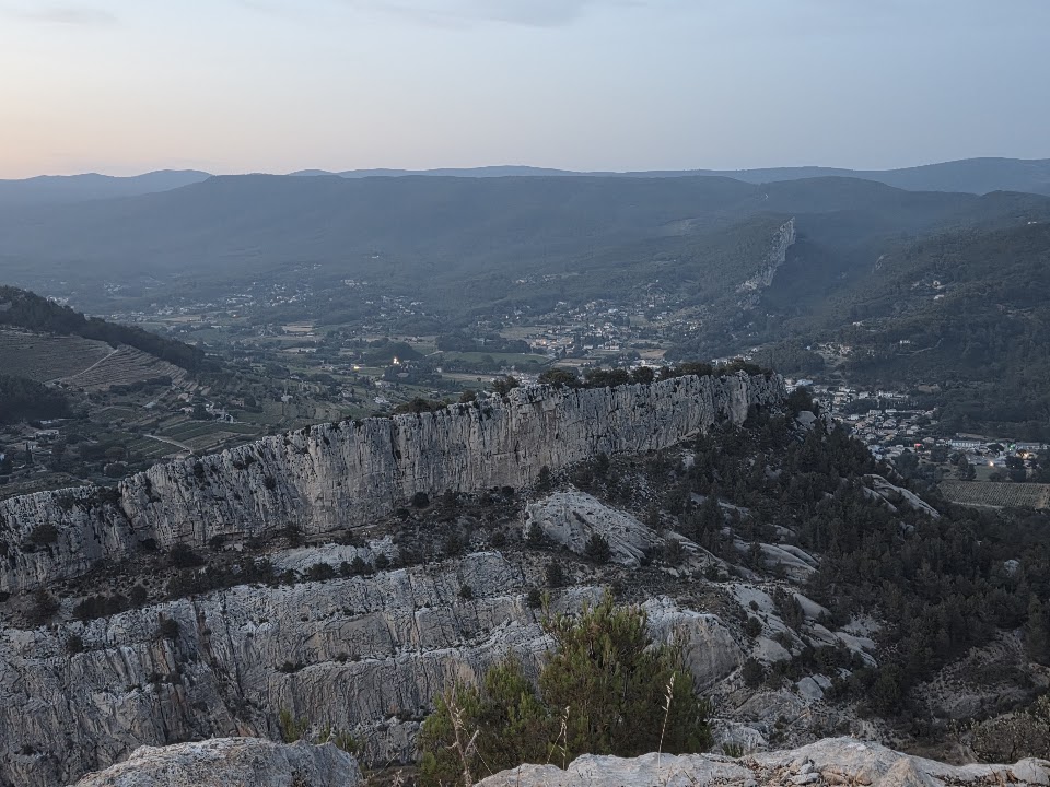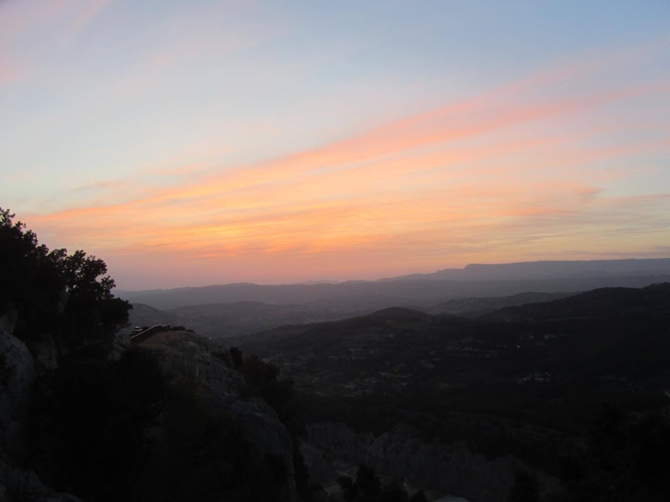 Parvenus au faîte de notre ascension, le ciel revêt sa parure orange sur la ligne coiffant la mer, puis le crépuscule s'invite progressivement lorsque nous nous installons pour piqueniquer.