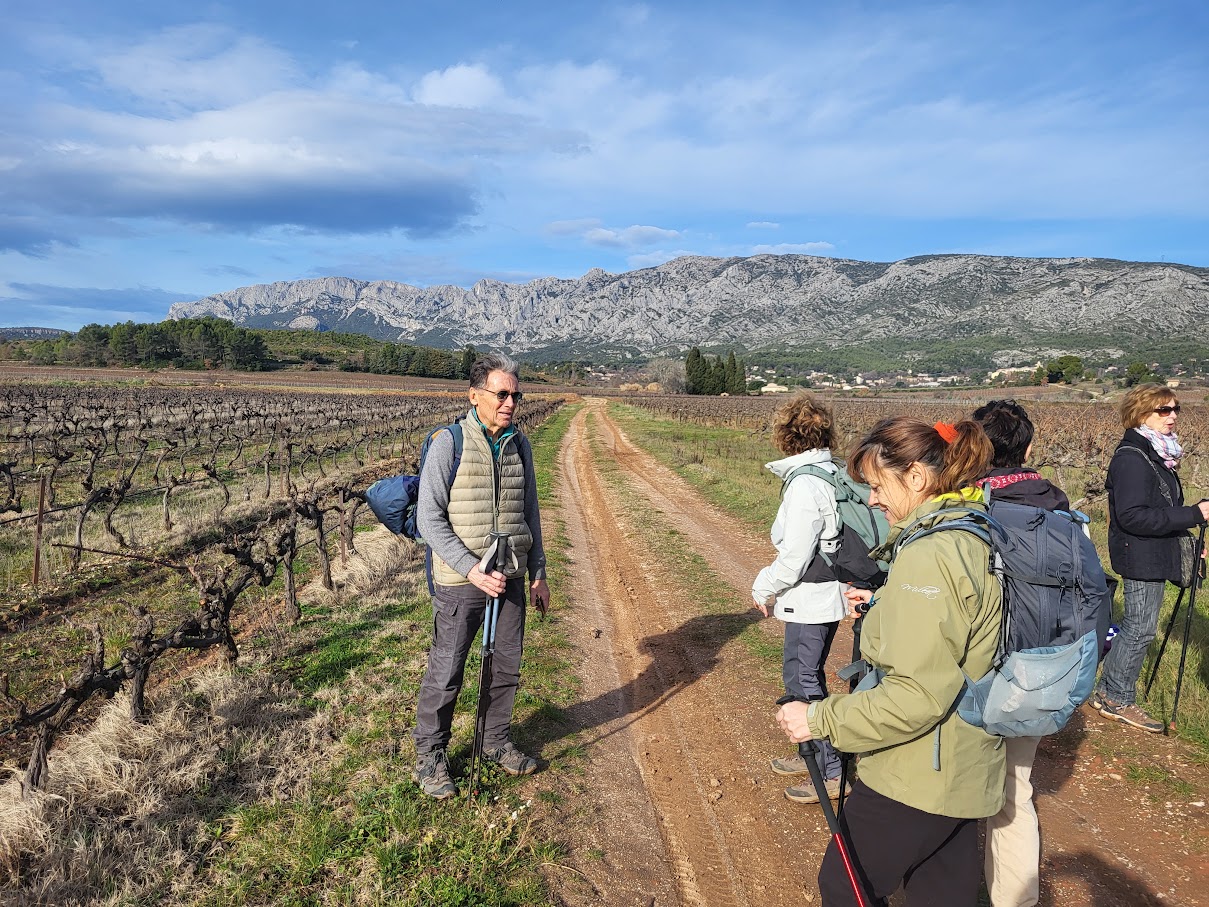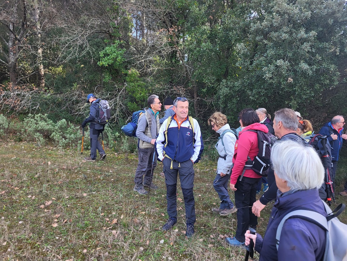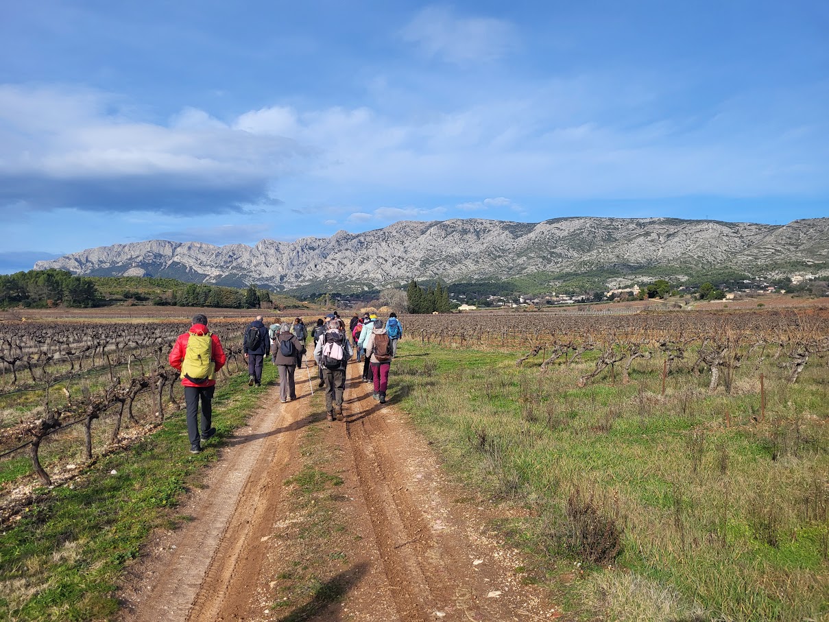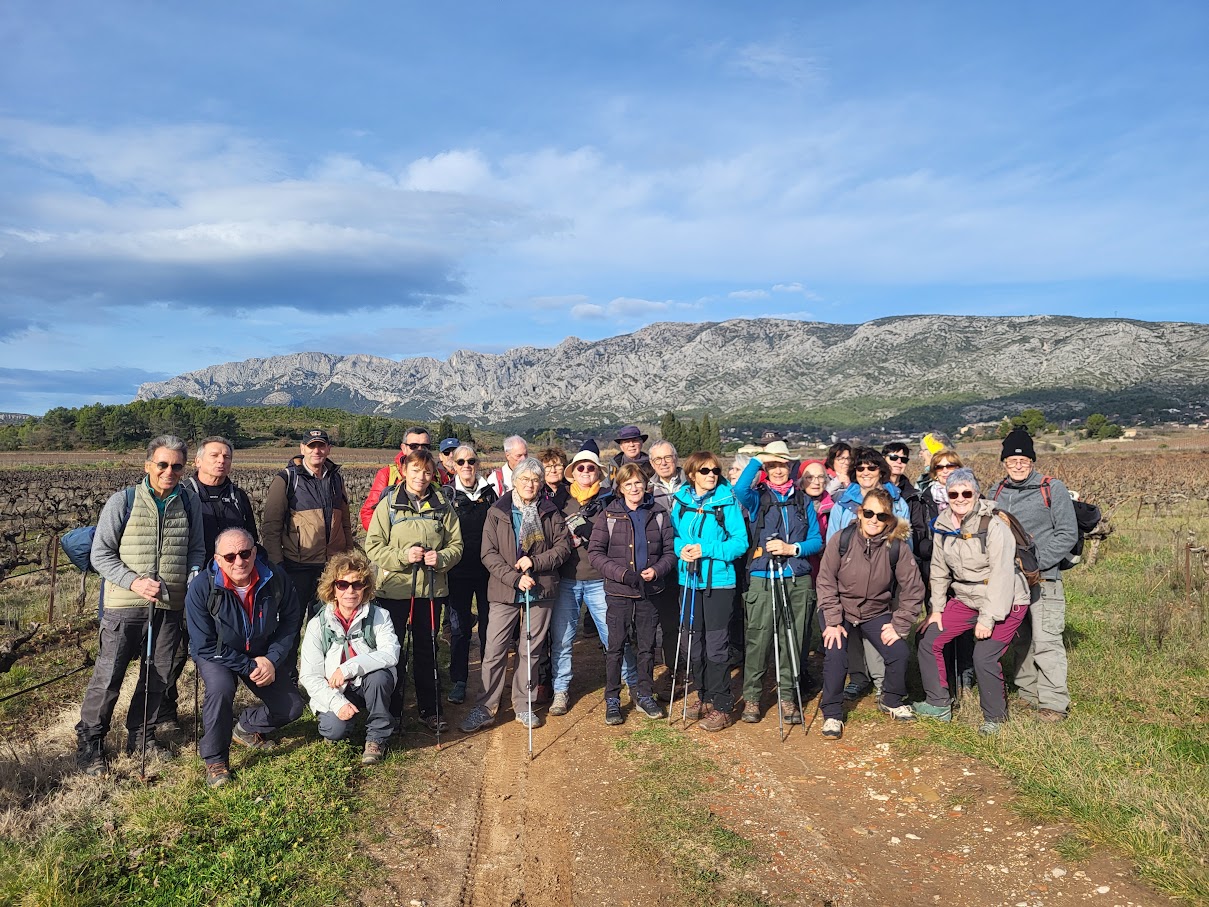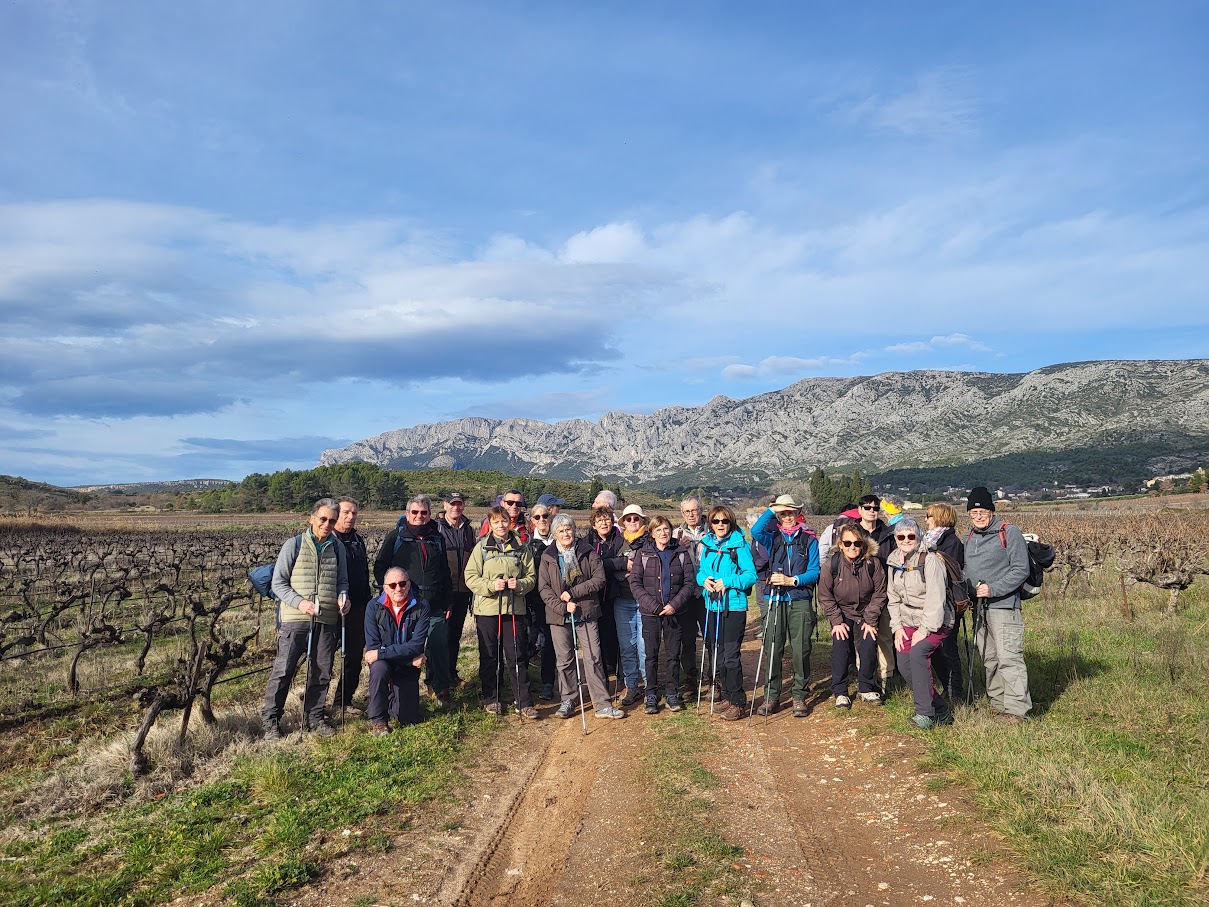 Tous à l’heure, nous sommes 31 réunis sur le parking d’Eden Forme où le covoiturage se forme. Un peu plus d’une heure plus tard et sans embouteillage, nous stationnons nos véhicules dans le centre de Puyloubier avant de nous diriger dans la campagne aixoise. Un beau soleil qui arrive à traverser les nuages nous réchauffe très vite et les discussions vont bon train puisque nous cheminons sans aucun dénivelé sur des chemins quelquefois boueux et parsemés ici et là de petites flaques d’eau.