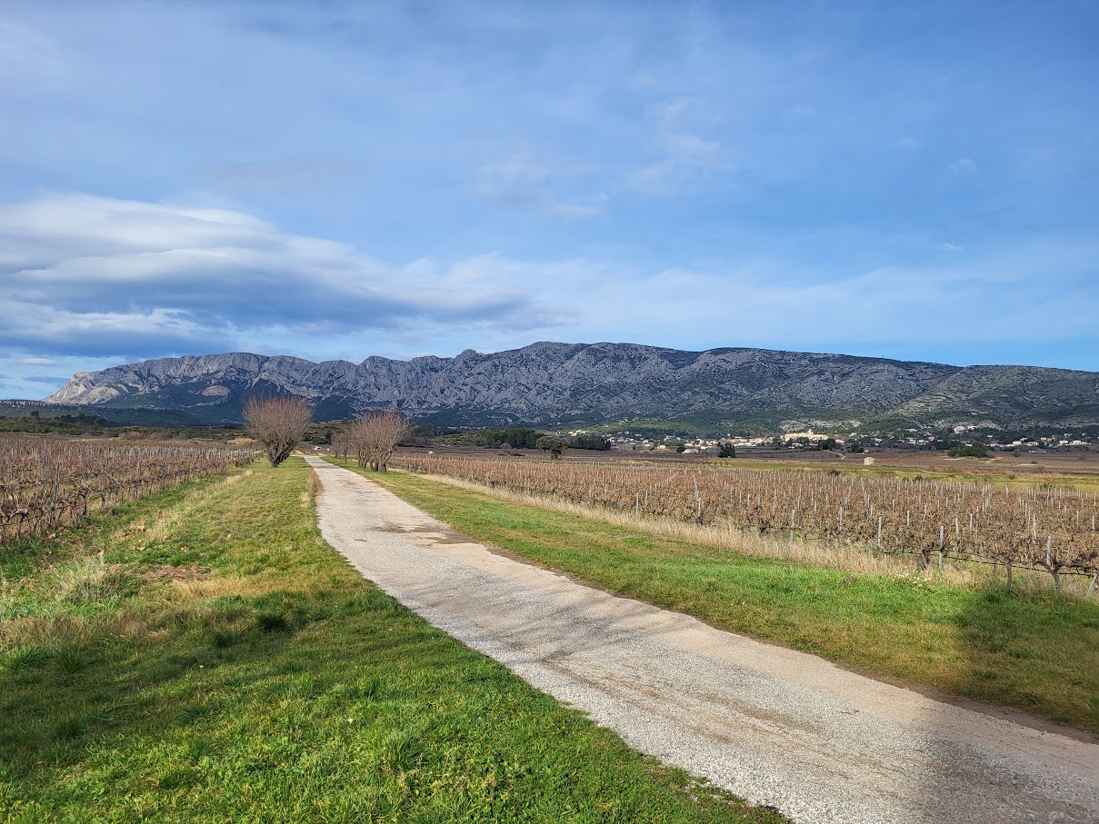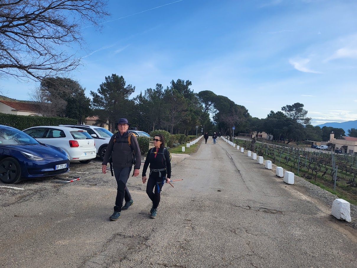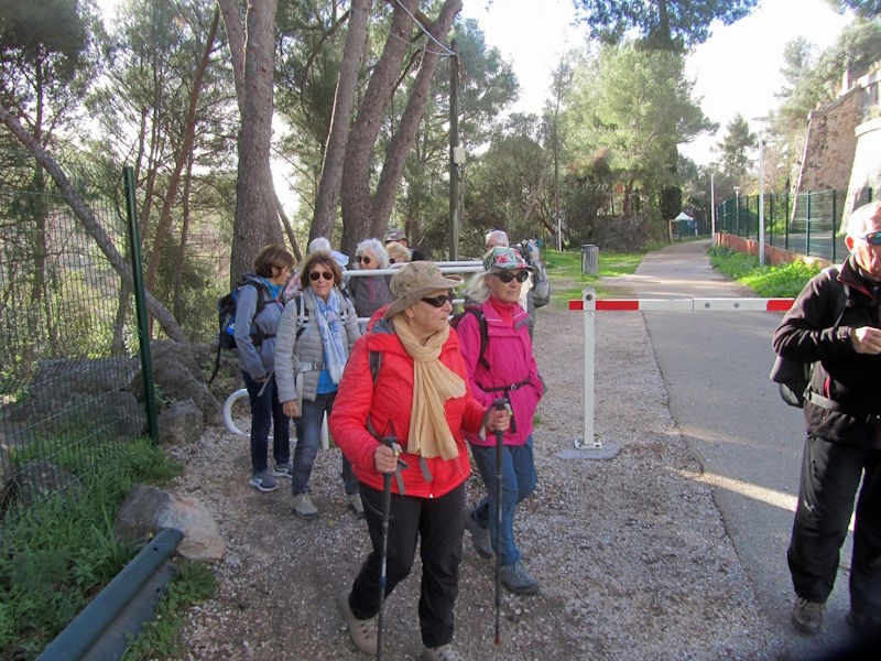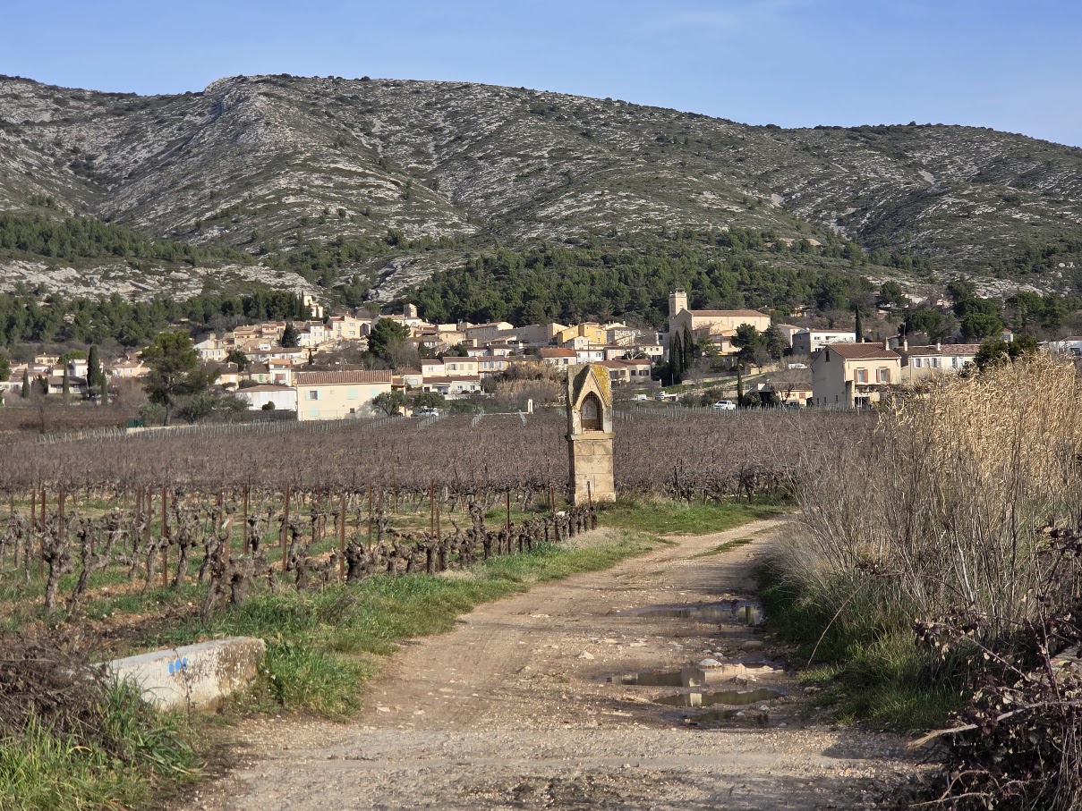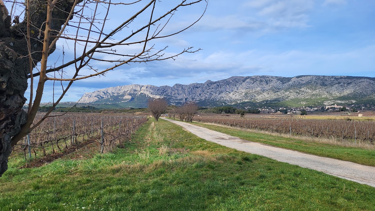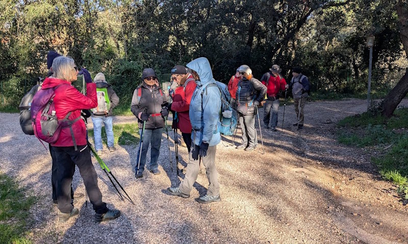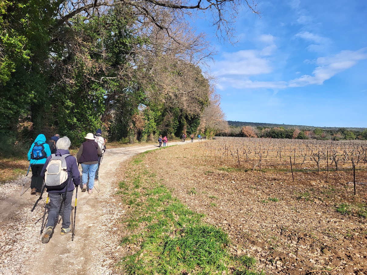 Tous à l’heure, nous sommes 31 réunis sur le parking d’Eden Forme où le covoiturage se forme. Un peu plus d’une heure plus tard et sans embouteillage, nous stationnons nos véhicules dans le centre de Puyloubier avant de nous diriger dans la campagne aixoise. Un beau soleil qui arrive à traverser les nuages nous réchauffe très vite et les discussions vont bon train puisque nous cheminons sans aucun dénivelé sur des chemins quelquefois boueux et parsemés ici et là de petites flaques d’eau.